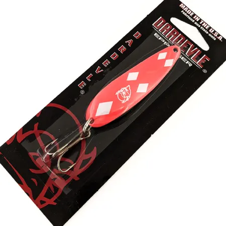 Con una longitud de 6,5 cm (2 1/2 pulgadas), este clásico de Eppinger aporta un toque de alta visibilidad a una silueta legendaria. Con un peso de 14 g (1/2 oz), la Dardevle Cop-E-Cat 7400 UV (Código de producto 13057) presenta un llamativo acabado rosa acentuado por cuatro diamantes distintivos y el logotipo de la cabeza del diablo. Mientras que el frente destaca por su color, el reverso mantiene un acabado de níquel tradicional. Este ejemplar no ha sido usado y se encuentra montado en su cartón original negro y rojo. Bajo la luz UV, los patrones de diamantes y el logotipo adquieren un brillo azul luminoso, una característica diseñada específicamente para aumentar la visibilidad en aguas profundas o turbias. El perfil cóncavo y la forma alargada de la cucharilla se producen utilizando moldes patentados en los EE. UU., una tradición de fabricación que Eppinger ha mantenido durante más de un siglo. Un robusto anzuelo triple de tono plateado está sujeto a la cola mediante un anilla abierta, lista para el lanzado o la cacea.