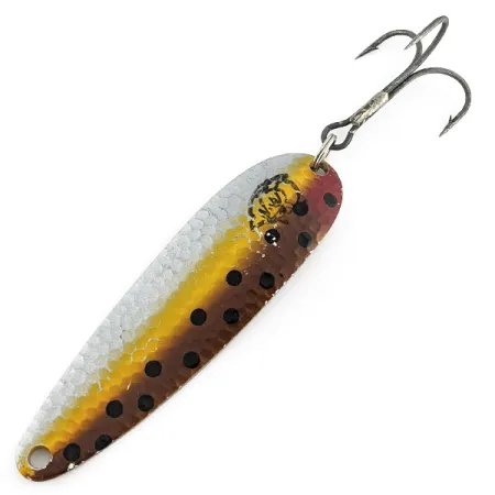 Un acabado martillado aporta a la parte frontal de esta cucharilla Eppinger un destello realista, capturando la luz sobre su patrón inspirado en la trucha común con tonos plateados, amarillos y marrones. Con un peso considerable de 50 g (1 3/4 oz), ofrece el lastre necesario para el curricán de profundidad o lances de larga distancia. El reverso del señuelo revela su origen en Michigan, grabado con 'COP-E-CAT 7700 DEARBORN MICH' y el reconocido logotipo del diablo sobre una superficie de latón limpio. Con una longitud de 11 cm (4 1/4"), el cuerpo metálico destaca por sus marcadas motas negras que contrastan con los degradados cálidos en amarillo y marrón. Este ejemplar en concreto, identificado con el código de producto 23290, mantiene un estado de conservación de 4/5, mostrando solo ligeras señales de su historial de pesca en los componentes originales. El gran anzuelo triple permanece firmemente sujeto mediante una anilla abierta reforzada, garantizando que la integridad estructural de la pieza se mantenga intacta.