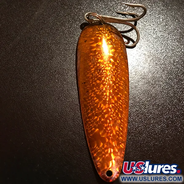 Con un peso de 28g (1oz) y una longitud de 9cm (3 1/2"), esta cucharilla muestra el inconfundible acabado 'Crystal' que refleja la luz a través de una cara texturizada en tonos anaranjados. Este ejemplar específico, catalogado bajo el código de producto 10963, tiene una calificación de 4/5, mostrando un ligero desgaste superficial que refleja su edad auténtica manteniendo un brillo excelente. Grabadas claramente en el reverso de cobre martillado se encuentran las palabras 'DARDEVLE DETROIT, USA', un sello de la historia de fabricación temprana de la compañía antes de su traslado a Dearborn en 1959. El dorso de color cobre es una elección funcional para este señuelo, ya que los pescadores utilizan tradicionalmente este tono metálico para mantener la visibilidad en aguas tomadas o turbias. Su perfil cóncavo característico está diseñado para producir una acción de bamboleo única durante una recogida constante. Los herrajes incluyen una anilla plateada resistente y un anzuelo triple afilado, montados para soportar grandes peces depredadores. Este clásico de Eppinger sigue siendo un testimonio de la visión original de Lou Eppinger de 1906 para una cucharilla de lanzado fiable.