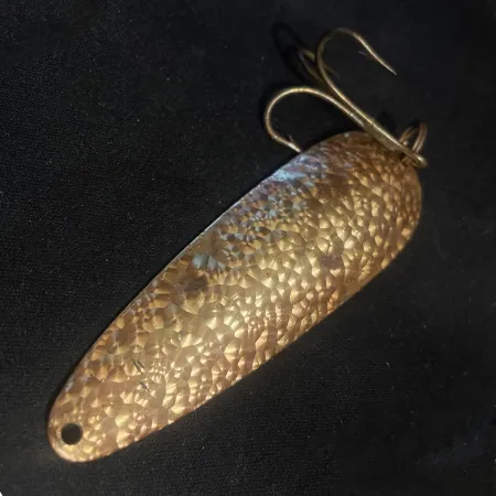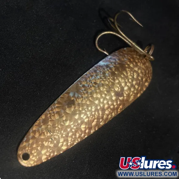 Con una medida de 9 cm (3 1/2"), el cuerpo metálico de esta cucharilla exhibe la artesanía clásica de Eppinger que ha definido a la marca desde 1906. Este modelo específico de Dardevle Crystal, identificado con el código de producto 24216, presenta una superficie martillada distintiva que distribuye la luz sobre su acabado en tono latón. Con un peso de 28 g (1 oz), posee la masa suficiente para alcanzar distancias de lance considerables o para practicar curricán de profundidad. El señuelo conserva su anzuelo triple original, unido mediante una anilla abierta, lo que demuestra que fue fabricado para ofrecer gran durabilidad. Eppinger ha producido estas piezas en EE. UU. durante generaciones, utilizando troqueles propios para mantener la forma oblonga específica y el perfil cóncavo que les dio fama originalmente en Detroit. El acabado muestra signos mínimos de antigüedad, manteniéndose en una sólida condición de 4/5. Históricamente, la efectividad de estos señuelos era tan reconocida que en su momento fueron equipo estándar en los kits de supervivencia de aviación del gobierno.