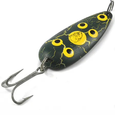 Un peso de 3/4 oz (21 g) le da a esta cucharilla suficiente masa para atravesar el viento de cara en lances largos. Revestida con el clásico acabado Frog, la hoja presenta una base oscura con un efecto craquelado amarillo y cinco puntos amarillos con centros negros. El icónico logotipo de la cabeza de diablo destaca en amarillo cerca del centro del cuerpo de 2 3/4" (7 cm). Al girar el señuelo se revela un reverso de níquel pulido, profundamente marcado con el sello del fabricante "DARDEVLET EPINGER DETROIT USA", un distintivo de las raíces de la empresa Eppinger en Michigan desde 1906. Este ejemplar en particular, identificado con el código 3284, está en un estado magnífico (5/5), con la pintura y los herrajes impecables. El montaje incluye un robusto anzuelo triple unido mediante una anilla abierta, listo para el curricán pesado o el lance. El contraste entre la parte superior oscura y texturizada y el dorso de níquel brillante crea un potente destello visual al moverse por el agua.
