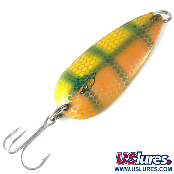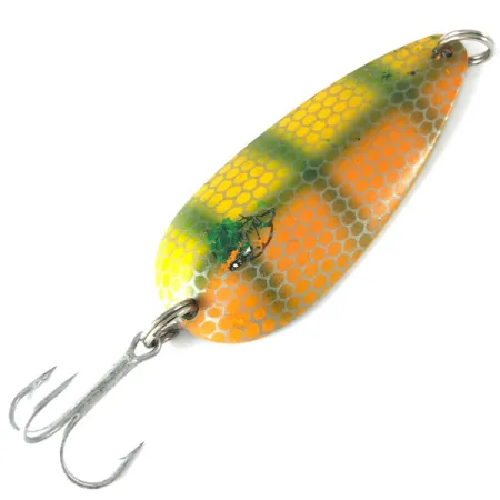 Llamativas barras verticales verdes sobre un fondo de panal amarillo y naranja definen la estética de este Eppinger Dardevlet vintage. Estampado en el reverso con 'DARDEVLET DETROIT USA', este ejemplar de 7 cm (2 3/4") es anterior al traslado de la marca a Dearborn en 1959 y pesa unos sólidos 21 g (3/4 oz). El código de producto 3695 identifica una cucharilla en condición 5/5, que muestra un acabado de níquel limpio en la superficie interior cóncava. Su forma oblonga y su construcción mediante troquelado están diseñadas para crear una acción de balanceo cuando se combina con una recogida lenta. Esta cucharilla fabricada en EE. UU. está equipada con su triple y anillas abiertas originales, reflejando la artesanía que llevó a los señuelos Dardevle a ser incluidos en los kits de supervivencia de la aviación militar. Los coleccionistas apreciarán la nitidez del sello de Detroit, que destaca su temprana historia de fabricación. Pequeños movimientos de la puntera de la caña durante la recogida pueden inducir un aleteo que a menudo desencadena la respuesta de peces depredadores curiosos.