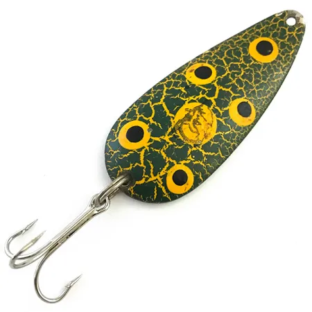 Texturas craqueladas en verde y amarillo definen el clásico acabado "Frog" de esta cucharilla ondulante de 21g (3/4oz). Este ejemplar particular de Eppinger, conocido como Dardevlet, lleva el código de producto 5408 y mide 7 cm (2 3/4") de longitud total. Se puede ver claramente el sello "DARDEVLET - DETROIT - U.S.A." en la parte posterior de níquel pulido, lo que vincula directamente con los primeros años de la empresa en Detroit antes de trasladarse a Dearborn en 1959. La superficie frontal está decorada con motas amarillas con centros negros, rodeando un círculo amarillo central que presenta el icónico logotipo de la cabeza de diablo. En cuanto a su estado, recibe una calificación de 5/5; el acabado pintado está excepcionalmente limpio y el niquelado de la cara cóncava mantiene un alto brillo. Viene montada con un anzuelo triple resistente y una anilla abierta de alta resistencia en la cabeza. Este modelo Dardevlet fue diseñado como una opción de tamaño medio en la gama, utilizando la forma cóncava patentada que Lou Eppinger desarrolló para influir en su trayectoria en el agua al lanzar o pescar al curricán.