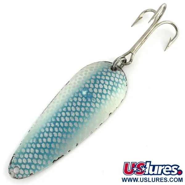 Un patrón de malla de escamas azules destaca sobre el acabado blanco de esta clásica cucharilla de lance. Grabado claramente en el reverso de níquel pulido se encuentra el nombre "DARDEVLET" junto con "DETROIT U.S.A.", marcando su herencia de la primera era de producción de Eppinger. Con un peso de 21 g (3/4 oz) y una longitud de 7 cm (2 3/4"), este ejemplar, identificado por el código de producto 8722, representa un peso clásico para lances a larga distancia o curricán de profundidad. La cara frontal presenta una textura distintiva de escamas creada por un pulverizado azul sobre una base blanca, proporcionando una visibilidad de alto contraste. Este señuelo conserva sus componentes originales, incluyendo un anzuelo triple robusto unido mediante una anilla abierta en la parte trasera. Con una calificación de estado de 4/5, la cucharilla muestra su edad con elegancia, con superficies limpias y un reverso metálico brillante. Sigue siendo una pieza funcional de la artesanía de Detroit de la legendaria línea Eppinger.