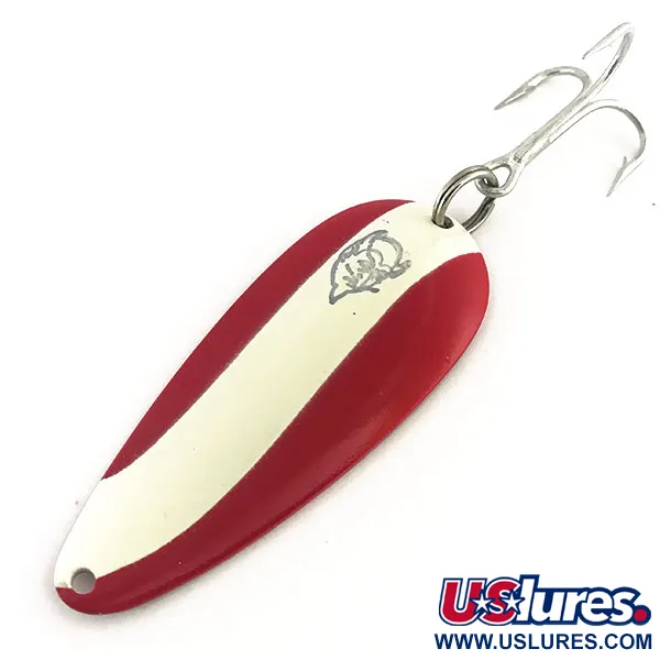 El cobre pulido en el reverso identifica a este ejemplar como una creación tradicional de Eppinger, con el sello «DARDEVLET» DETROIT U.S.A. Una robusta anilla de color plateado une el cuerpo de la cucharilla de 7 cm (2 3/4") a un afilado anzuelo triple. Catalogado bajo el código de producto 8943, este señuelo de 21 g (3/4 oz) está acabado con las reconocibles rayas verticales rojas y blancas en su cara frontal. El logotipo de la cabeza de diablo es claramente visible, grabado en la franja blanca central. El sello de Detroit en el lomo de cobre apunta a la temprana historia del fabricante en Michigan, fechando este diseño antes de su traslado a Dearborn en 1959. Con una superficie muy limpia y la pintura bien conservada, el estado de este ejemplar está calificado como 5/5. Está fabricado en metal de gran grosor, diseñado para lograr distancia de lanzado y control de profundidad en diversas condiciones de agua.