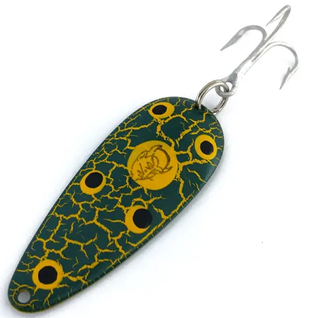 El peso de 3/4oz (21g) de esta cucharilla vintage la convierte en una opción sólida para alcanzar aguas profundas o mantener el control durante lances largos. Identificada con el código 9750, esta Eppinger Dardevle Dardevlet luce el acabado clásico "Frog", una llamativa combinación de un patrón craquelado verde oscuro sobre una base amarilla. Cinco puntos amarillos distintos con centros negros se distribuyen por el cuerpo, enmarcando el icónico logotipo de la cabeza de diablo en el centro. Con una longitud de 2 3/4" (7cm), el cuerpo mantiene la forma cóncava patentada que la empresa Eppinger ha perfeccionado en su fábrica de Michigan desde 1959. El reverso es de níquel pulido, profundamente troquelado con la marca del fabricante y su origen en Dearborn, EE. UU. Está equipada con el anzuelo triple original en tono plateado y una anilla abierta reforzada. Este ejemplar no ha sido usado y se encuentra en una condición 6/5, conservando el brillo de fábrica tanto en la cara pintada como en la parte posterior metálica. Los troqueles de fabricación utilizados aquí son específicos de la marca, lo que garantiza que las dimensiones físicas cumplan con los estándares establecidos por Lou Eppinger hace más de un siglo.