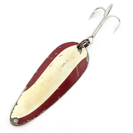 Un acabado Red Devle define a esta cucharilla vintage, que presenta la icónica franja central blanca situada entre dos secciones carmesí. Este ejemplar de 3/4 oz (21 g) muestra signos auténticos de uso en el agua, con pérdida de pintura y desconchones visibles en los bordes, lo que refleja su historia como un veterano de la caja de aparejos con un estado de conservación de 3/5. Con una longitud de 7 cm (2 3/4"), su cuerpo de metal de calibre grueso lleva grabado en el reverso la clásica identificación '“DARDEVLET” DETROIT U.S.A.', un sello distintivo de la producción de Eppinger de la época de 1920 a 1940. Catalogado con el código de producto 22794, el señuelo está equipado con una anilla abierta robusta y un único anzuelo triple grande en la cola. La parte posterior metálica sigue siendo reflectante, contrastando con el esmalte desgastado de la parte frontal. Este señuelo de fabricación estadounidense fue diseñado para el lance en aguas más profundas, donde su peso específico permitía alcanzar profundidades inaccesibles para cucharillas más pequeñas.