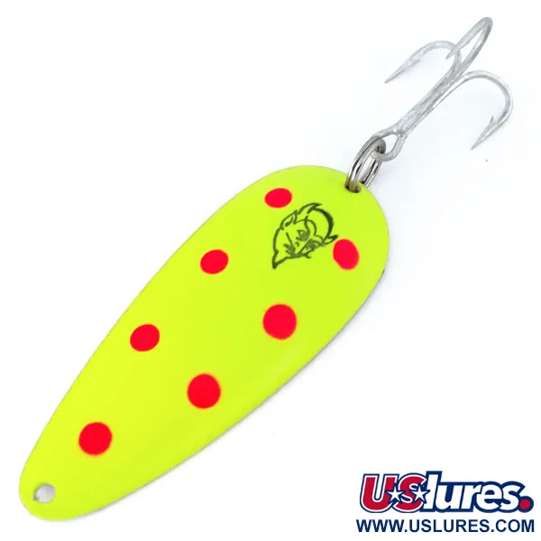 Una pintura amarilla de alta visibilidad con llamativos puntos rojos define el aspecto impactante de esta clásica cucharilla ondulante Eppinger. Este espécimen de 21 g (3/4 oz) tiene una longitud de 7 cm (2 3/4") y muestra el icónico logotipo Devil Head estampado claramente en la cara frontal. Lo que diferencia a esta Dardevlet en particular es el acabado UV glow; mientras que a la luz del día se ve como un amarillo fluorescente brillante, revela un resplandor verde luminoso bajo la luz ultravioleta, proporcionando visibilidad en aguas profundas o turbias. La parte posterior del señuelo está acabada en níquel pulido, lo que ofrece destellos metálicos mientras el cuerpo cóncavo se mueve a través de la columna de agua durante el lanzado o el curricán. Identificada con el código de producto 10814, este señuelo está sin usar. El montaje está impecable, con un robusto anzuelo triple sujeto por una fuerte anilla de llavero. Sigue siendo un excelente ejemplo de las tradiciones de fabricación estadounidenses establecidas por Lou Eppinger cuando comenzó a fabricar señuelos a mano en Detroit hace más de un siglo.