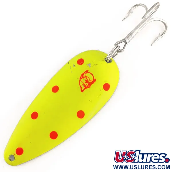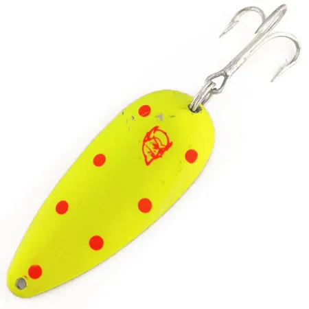 Con una medida de 7 cm (2 3/4 pulgadas), esta cucharilla está acabada en un color Chartreuse de alta visibilidad con puntos rosas sobre una base de níquel pulido. Este modelo Dardevlet, identificado con el código de producto 12410, pesa 21 g (3/4 oz) y presenta el icónico sello de la cabeza del diablo rojo, un tributo a los inicios de la marca en Detroit bajo la dirección de Lou Eppinger en 1906. Diseñada como una variante fluorescente UV Glow, la pintura especializada proporciona una luminiscencia verde intensa en entornos de poca luz, lo que la convierte en una opción técnica para aplicaciones en aguas profundas. El señuelo está equipado con un anzuelo triple afilado y un robusto anilla abierta, ambos con un desgaste mínimo. En su estado actual de 5/5, la pintura está excepcionalmente limpia y el niquelado del reverso permanece brillante. Eppinger utiliza troqueles patentados específicos para crear la característica forma oblonga del metal, lo que permite distancias de lanzado considerables incluso en condiciones de viento.