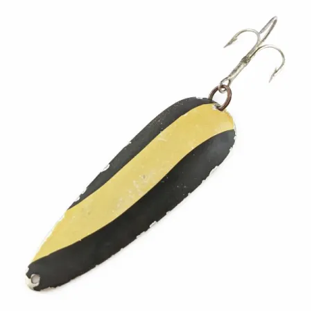 Con un peso sustancial de 1 oz (28 g), esta cucharilla en forma de lágrima representa una pieza significativa de la historia de la pesca estadounidense de la década de 1930. El acabado Black Devle presenta una llamativa franja diagonal amarilla sobre un fondo negro intenso, un esquema de color característico de la primera etapa de producción de Eppinger en Detroit, EE. UU. Con una longitud de 3 1/2" (9 cm), el cuerpo metálico muestra ligeras señales del paso del tiempo con una valoración de estado de 4/5, presentando un leve desgaste de pintura en los bordes. Un anzuelo triple grande está sujeto a la parte trasera mediante una anilla metálica, diseñado para el lanzado o curricán de grandes depredadores de agua dulce. Esta rareza vintage, identificada con el código de producto 24040, sigue siendo una pieza fundamental para cualquier colección centrada en la evolución de la icónica marca Dardevle.