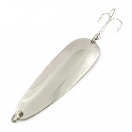 Claramente troquelado en el interior cóncavo, el rótulo "Dardevle Detroit USA" identifica a esta cucharilla de casting de mediados de siglo. El acabado en níquel brillante a lo largo del cuerpo de 3 1/2" (9 cm) proporciona un destello nítido, lo que la hace muy visible durante la recogida. Con un peso de 1 oz (28 g), el denso cuerpo de metal facilita los lances de larga distancia incluso en condiciones de viento. Este espécimen de la década de 1950, catalogado bajo el código 24592, mantiene una superficie limpia y reflectante, con una calificación de estado de 4/5. La forma de lágrima y la distribución del peso son adecuadas para presentaciones en aguas profundas y curricán constante.