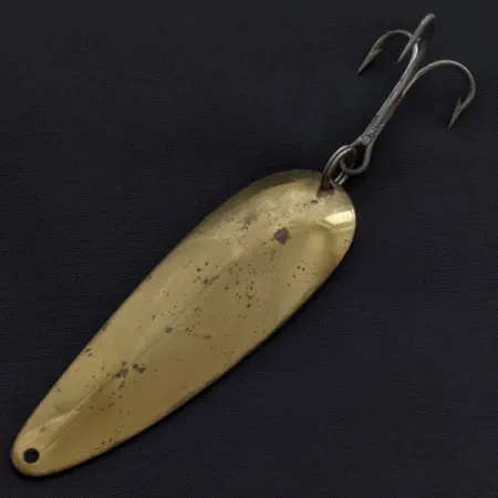 Con un peso de 28 g (1 oz), esta cucharilla de lance con acabado en latón ofrece la masa necesaria para alcanzar los apostaderos de aguas profundas. Esta Eppinger Dardevle (Detroit) mide 9 cm (3 1/2") y representa una era clásica de la fabricación de señuelos estadounidenses. El reverso presenta el grabado auténtico de la marca que identifica sus orígenes en Detroit, EE. UU., un detalle muy valorado por los coleccionistas de aparejos de principios del siglo XX. El código de producto 21237 identifica este modelo específico de gran peso. En cuanto a los componentes, el anzuelo triple está sujeto por una anilla abierta robusta, mostrando algunos signos leves de antigüedad. La superficie de latón muestra manchas dispersas tras años en una caja de pesca, pero conserva un brillo cálido y lustroso en su totalidad. Su estado es un respetable 4/5, lo que indica un ejemplar bien conservado que permanece estructuralmente sólido. El perfil cóncavo es característico de las matrices exclusivas que Eppinger ha utilizado para definir la silueta distintiva de sus cucharillas desde la fundación de la firma en 1906. Un pequeño punto de enganche circular en el extremo estrecho completa la configuración tradicional de esta leyenda fabricada en Michigan.