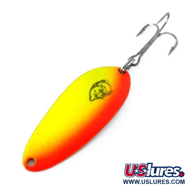 Con una longitud de 5 cm (2"), este ejemplar presenta un vibrante degradado fluorescente que va desde un amarillo brillante hasta un naranja intenso. Este señuelo Eppinger específico lleva el sello "DEVLE-DOG 5300 DETROIT U.S.A." en su reverso niquelado, un identificador de sus raíces de fabricación antes de que la empresa se trasladara en 1959. Con un peso de 10 g (1/3 oz), el cuerpo de metal macizo está equipado con un robusto anzuelo triple sujeto por una anilla abierta reforzada. La cara frontal está decorada con el clásico logotipo negro de la cabeza del diablo, sinónimo de la larga historia de la marca en Michigan. Diseñado con propiedades UV Glow, el acabado está pensado para proporcionar visibilidad en condiciones de poca luz o en capas de agua más profundas durante el lanzado o el curricán. Este ejemplar, identificado con el código de producto 10361, está sin usar y presenta un estado excepcional. El niquelado del reverso es brillante, contrastando con la pintura fluorescente de alta visibilidad del lado convexo.