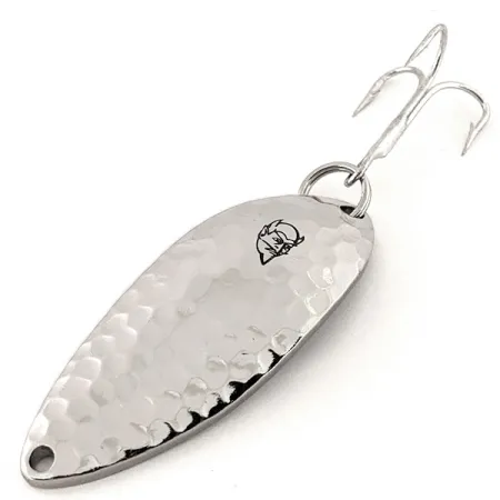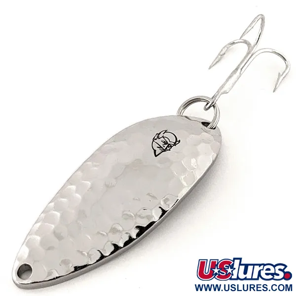 El níquel martilleado proporciona una textura brillante que capta la luz en la parte frontal de esta cucharilla ondulante, un acabado diseñado para una alta visibilidad. Con un peso de 3/5oz (16g), esta Eppinger Dardevle Devle Dog 5400 se identifica con el código de producto 13067. El icónico logotipo de la cabeza de diablo está claramente estampado en el centro del lado texturizado, mientras que el reverso liso presenta grabados profundos para el nombre del modelo y el lugar de fabricación en Dearborn, Michigan. Este ejemplar está en condición 5/5, presentando una superficie brillante y limpia y herrajes originales, incluido un robusto anzuelo triple unido mediante un anilla abierta. Eppinger ha utilizado estos moldes patentados en su fábrica de Michigan desde que se mudaron de Detroit en 1959, manteniendo la construcción pesada en la que coleccionistas y pescadores han confiado durante más de un siglo. El orificio de enganche en la punta permanece despejado y bien formado para montajes de lanzado o curricán.