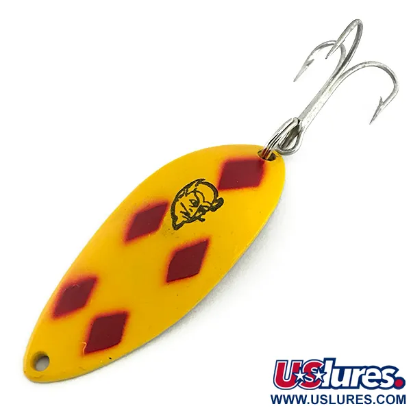 En la parte posterior de latón pulido de este ejemplar están grabadas las palabras "DEVLE DOG 5400" y "DETROIT U.S.A.", un claro guiño a las raíces en Michigan de Eppinger Manufacturing. Con una longitud de 5,5 cm (2 1/4") y un peso de 14 g (1/2 oz), esta cucharilla presenta el icónico diseño Five of Diamonds: cinco rombos rojos distintos dispuestos con precisión sobre un acabado amarillo vibrante. El clásico logotipo negro de la cabeza del diablo está impreso con nitidez en la cara, un sello distintivo de la marca fundada por Lou Eppinger en 1906. Este artículo vintage, catalogado con el código de producto 8724, no ha sido usado y conserva su brillo original y su pintura intacta. La construcción incluye un robusto anzuelo triple de tono plateado sujeto por una anilla abierta en la parte trasera y un enganche para la línea perforado en la cabeza. Su forma cóncava y oblonga es el resultado de los moldes patentados utilizados en el proceso de fabricación estadounidense, diseñados específicamente para el lanzado o el curricán.