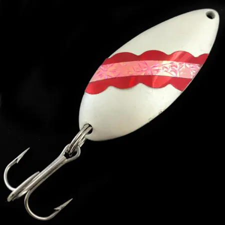 Con el sello 'DEVLE-DOG 5400 DETROIT U.S.A.' grabado en el reverso, esta cucharilla Eppinger es un clásico de la historia de la pesca en Michigan. El frontal presenta una base en color White Pearl, flanqueada por franjas rojas onduladas y una incrustación central de cinta holográfica rosa que refleja la luz. Este ejemplar, con código de producto 5535, mide 5,5 cm (2 1/4") y pesa 18 g (2/3 oz). Diseñada para ser versátil, la cucharilla está clasificada como tipo UV Glow y Fluorescente, utilizando acabados especializados para mantener la visibilidad en aguas profundas o turbias. El equipo incluye un anzuelo triple de alta calidad conectado mediante un anilla abierta, junto con un único orificio de enganche en el extremo estrecho. Por su acabado y componentes, el señuelo se encuentra en estado sin usar. Eppinger utiliza moldes propios para sus cucharillas desde 1906, y la forma cóncava de esta serie 5400 está diseñada para generar un movimiento de balanceo específico durante la recogida. Es un señuelo sólido y resistente que encaja perfectamente tanto en la vitrina del coleccionista como en la caja de pesca.