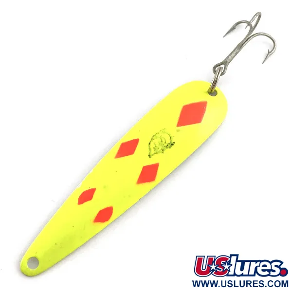 Con exactamente 8,5 cm (3 1/4") de longitud, la Dardevle Flutter Chuck #3100 demuestra por qué el patrón Cinco Diamantes sigue siendo uno de los favoritos para los pescadores de lucio y trucha. Con un peso de 9,5 g (1/3 oz), esta cucharilla Eppinger, catalogada con el código de producto 23470, es ideal para el lanzado en estructuras profundas. Presenta cinco rombos rojos sobre un llamativo acabado amarillo, con el icónico logo del diablo del fabricante centrado en la cara frontal. El montaje incluye un anzuelo triple sujeto mediante una anilla abierta en la base del cuerpo estilizado de la cucharilla. Fabricada en EE. UU., su construcción metálica presenta una valoración de estado de 5/5, mostrando la alta calidad de su pintura y estampados originales. El señuelo está diseñado para técnicas estándar de lanzado o curricán en agua dulce.