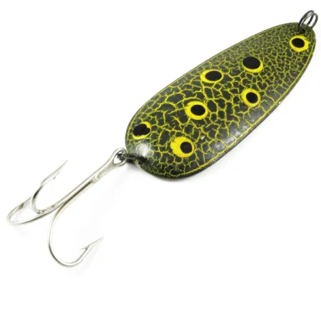 Grabado claramente en el reverso de níquel pulido se encuentra la marca Lou J. Eppinger Mfg. Co. de la era de Detroit, Michigan, lo que vincula firmemente esta pieza con el legado temprano de la marca. Este Dardevle Huskie Junior, código de producto 3233, pesa unas sustanciales 2 oz (58g) y mide 4 1/2" (11,5 cm), lo que lo convierte en una opción pesada destinada al lanzado profundo o al curricán. La parte superior presenta un complejo acabado craquelado verde y amarillo, punteado por siete distintivas manchas negras con borde amarillo que crean un perfil visual de alto contraste. Sus herrajes incluyen una anilla abierta de alta resistencia en el enganche de la línea y un robusto anzuelo triple de gran calibre que se mantiene estructuralmente sólido. La superficie pintada y el reverso metálico están bien conservados y limpios, reflejando una calificación de condición de 4/5. Al ser el modelo Huskie Junior, utiliza la clásica silueta de perfil ancho que Eppinger estandarizó hace más de un siglo. El grabado en el lado cóncavo es profundo y legible, destacando la artesanía de la fábrica original de Detroit.