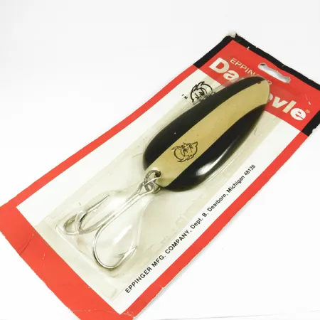 Con 58 g (2 oz), esta sustancial variante Huskie Junior de la legendaria cucharilla Dardevle tiene masa suficiente para alcanzar lucios y muskies de profundidad. Las raíces de Eppinger en Dearborn, Michigan, son visibles en el cartón vintage, que presenta los clásicos gráficos rojos y blancos utilizados por la empresa durante décadas. El esquema de color Black / White / Nickel proporciona un patrón de rayas de alto contraste en el lado convexo, combinado con el icónico logotipo de la cabeza del diablo estampado directamente en el metal. Con una medida de 11,5 cm (4 1/2"), el cuerpo estampado refleja la geometría específica desarrollada por Eppinger para crear un movimiento distintivo sin necesidad de pesos adicionales. Este ejemplar, identificado con el código de producto 3537, permanece sin usar en su blíster original, conservando el acabado de níquel brillante en el lado cóncavo y los anzuelos triples afilados y resistentes. El embalaje destaca la designación Huskie Junior, un tamaño diseñado específicamente para grandes depredadores en grandes masas de agua. En el reverso, el etiquetado original de Eppinger Mfg. Company aporta el contexto histórico de su época de fabricación en Dearborn.