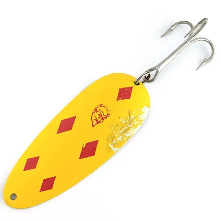 Con un peso considerable de 58 g (2 oz), esta robusta pieza de la historia de la pesca de Michigan está diseñada específicamente para capturar grandes depredadores. Esta Eppinger Dardevle Huskie Junior serie 700, catalogada con el código de producto 22182, presenta el legendario acabado "Five of Diamonds": cinco rombos rojos nítidos sobre una base amarilla vibrante. La cara frontal muestra el reconocible logotipo del diablo rojo, mientras que el reverso está grabado claramente en el latón con "700 SERIES", "LOU J. EPPINGER", "HUSKIE JR." y "DEARBORN MICH."