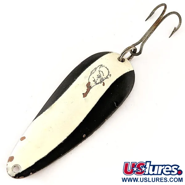 Estampado en el reverso de cobre, el logotipo "DARDEVLE IMP U.S.A." marca esta cucharilla de 5,5 cm (2 1/4") como una pieza auténtica de la historia de la pesca de Michigan. Con un peso de 11 g (2/5 oz), el cuerpo metálico presenta un patrón de rayas verticales de alto contraste en blanco y negro, una combinación versátil para varios niveles de claridad del agua. Este ejemplar específico, catalogado bajo el código de producto 12451, muestra un estado de 4/5, con ligeras pérdidas de pintura en los bordes y la superficie frontal que revelan el sustrato de cobre sin desmerecer el gráfico central de la cabeza de diablo. El diseño cóncavo característico de Eppinger proporciona a la cucharilla su acción de balanceo característica durante una recogida lineal, un sello de diseño técnico que se ha mantenido constante desde que Lou Eppinger comenzó a fabricarlas a mano en su sótano. Los herrajes siguen siendo robustos, con un anzuelo triple clásico sujeto por una anilla abierta resistente, adecuado tanto para lance como para curricán.