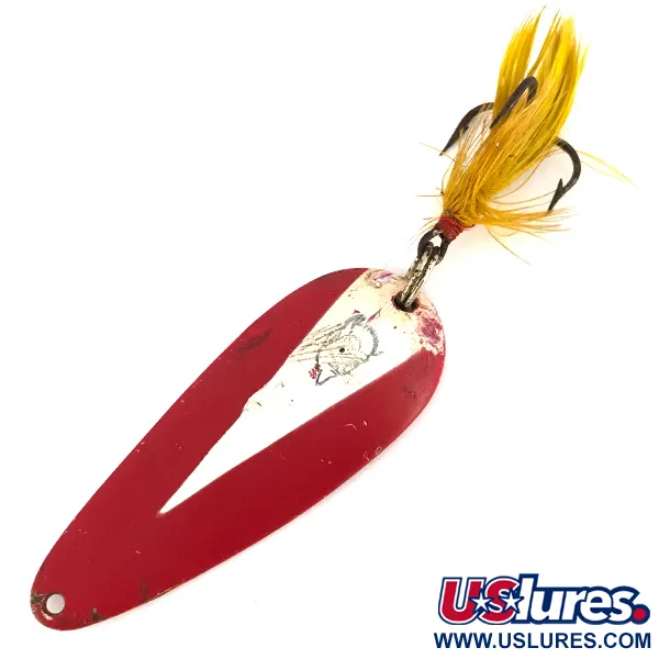 Claramente troquelada en el reverso con acabado de cobre, la marca "DARDEVLE IMP U.S.A." identifica este clásico de 5,5 cm (2 1/4") como un auténtico original de Eppinger. Este ejemplar específico de 11 g (2/5 oz) presenta el icónico patrón rojo y blanco en el frente cóncavo, mostrando cierto carácter a través de pequeños saltos en el esmalte que revelan el metal inferior. Los herrajes se mantienen robustos, incluyendo un anzuelo triple con plumas amarillas brillantes atadas con hilo rojo para crear un perfil más voluminoso. Con una calificación de 4/5, la cucharilla muestra señales de haber sido una pieza de confianza en la caja de pesca manteniendo su color vibrante. Eppinger utiliza moldes propios desde 1906 para lograr esta geometría oblonga específica, un diseño tan fiable que la marca fue seleccionada en su día para kits de supervivencia de la aviación militar. Al lanzar este código de producto 7790, el reverso bañado en cobre proporciona un destello cálido especialmente visible en aguas tomadas o condiciones de poca luz.