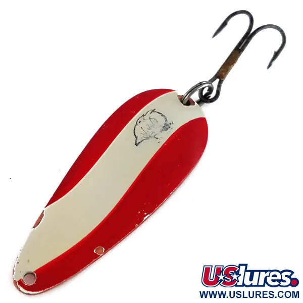 Claramente estampado en el reverso con acabado de cobre, el sello "DARDEVLE IMP U.S.A." identifica este señuelo como una creación genuina de Eppinger. Este ejemplar en particular, con el código de producto 9799, presenta el clásico patrón de rayas esmaltadas en rojo y blanco en su cara frontal, acompañado del icónico logotipo de la cabeza de diablo. Con una medida de 5,5 cm (2 1/4") y un peso de 11 g (2/5 oz), el estado de la cucharilla es de 4/5, mostrando un desgaste auténtico de la pintura y pequeños desconchones cerca de los bordes y el ojal. La base de cobre de gran espesor proporciona el peso necesario para el lanzado, mientras que la parte trasera está equipada con un robusto anzuelo triple sujeto mediante un anilla abierta. Fabricado históricamente por la empresa de Michigan fundada por Lou Eppinger en 1906, el modelo Imp refleja el diseño de mediados de siglo que permitió incluir estos señuelos en los kits de supervivencia de aviación. Pequeñas zonas de metal expuesto en la cara roja y blanca muestran el envejecimiento del esmalte, mientras que el dorso de cobre permanece limpio y bien conservado.