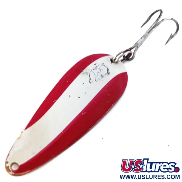 Las franjas de esmalte rojo y blanco definen la cara de esta pieza clásica, un patrón que ha sido un elemento básico en las cajas de pesca durante generaciones. Esta Eppinger Dardevle Imp Copper Back, identificada con el código de producto 10645, pesa 11g (2/5oz) y mide 5,5cm (2 1/4"). La pintura vibrante en el lado cóncavo se combina con un dorso de cobre macizo, una configuración específica favorecida por proporcionar un destello cálido y sutil en aguas turbias. Tras una inspección cercana, el estampado "DARDEVLE IMP U.S.A." en la parte posterior permanece profundo y claro. Esta cucharilla está en condiciones 5/5, mostrando una superficie brillante y limpia con mínimos signos de edad. El equipo incluye un robusto anzuelo triple asegurado por una anilla abierta de alta resistencia, lo que refleja la calidad de fabricación estadounidense por la que Eppinger es conocida. El cuerpo metálico tiene un peso significativo para su tamaño, lo que ayuda en el lance de larga distancia en condiciones de viento.