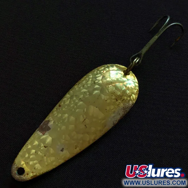 Reflejando la luz a través de una superficie texturizada con patrón de escamas, esta cucharilla de 5,5 cm (2 1/4") muestra el distintivo acabado "Crystal" de Eppinger, muy buscado por coleccionistas por su brillo único. Con un peso de 11 g (2/5 oz), el cuerpo metálico presenta el icónico sello "DARDEVLE IMP" claramente troquelado en el lado cóncavo, identificado bajo el código de producto 20779. Los herrajes consisten en un robusto anzuelo triple sujeto por una anilla abierta resistente, junto con un orificio para la línea limpio en la cabeza estrecha. La evaluación de este ejemplar revela un estado de conservación 4/5, con ligeras marcas superficiales visibles en el acabado martillado que muestran su antigüedad, siendo un ejemplar sólido para cualquier vitrina vintage. Su fabricación estadounidense sigue siendo robusta, preservando el clásico perfil en forma de lágrima diseñado para el lanzado y el curricán.