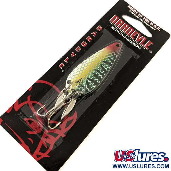 Un vibrante acabado con textura de escamas en tonos verdes, amarillos y rojos define esta clásica Dardevle Imp Klicker de Eppinger. Este espécimen lleva el código 13099 y se encuentra sin usar, aún fijado en su embalaje original. Con una longitud de 5,5 cm (2 1/4") y un peso de 11 g (2/5 oz), esta cucharilla ondulante es una opción consagrada para la pesca de black bass, trucha y salmón. El diseño "Klicker" se distingue por las dos pequeñas paletas sonoras unidas al anilla abierta del anzuelo triple, que emiten un sonido mecánico al golpear el cuerpo de la cucharilla durante la recogida. Este modelo está acabado con un dorso de cobre cálido, una variante específica pensada para mantener una alta visibilidad en diversas condiciones del agua. Fabricado en Dearborn, Michigan, el señuelo destaca por los moldes patentados y los estándares de producción estadounidenses que han definido a la marca desde 1906. El patrón de color 59 Black Perch (B) se complementa con el logotipo "DARDEVLE" troquelado y herrajes plateados de gran calidad.