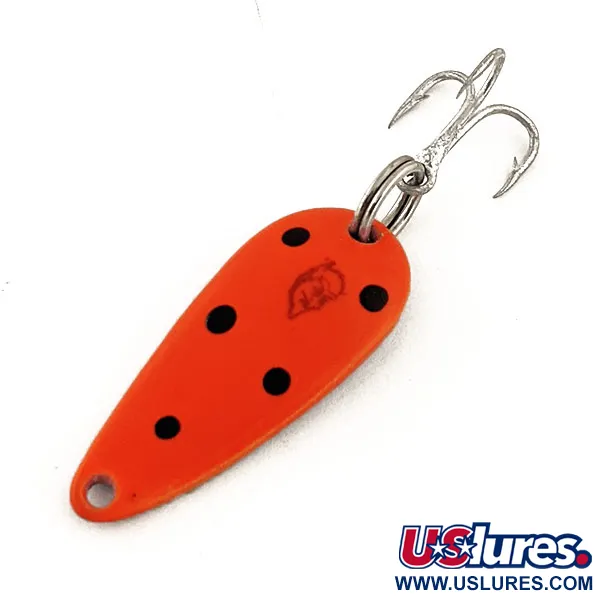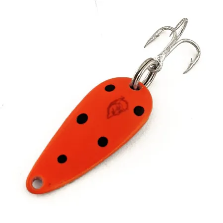 Negros puntos audaces contrastan fuertemente contra la superficie naranja-roja fluorescente de esta cucharilla de 3 cm. Estampada con el icónico logotipo de la cabeza del diablo, esta Eppinger Dardevle Lildevle UV lleva el código 12820. El reverso de níquel proporciona un destello secundario, mientras que la pintura especializada ofrece un brillo significativo bajo luz UV: un giro moderno a un legado de Michigan que se remonta a los diseños originales de Lou Eppinger de 1906. Con 3,4 g (1/8 oz), ofrece suficiente densidad para lances precisos hacia estructuras o bancos de peces. El equipo incluye un robusto anilla abierta y un afilado anzuelo triple plateado, ambos en excelentes condiciones con una calificación de 5/5. Los troqueles patentados de Eppinger le dan a esta cucharilla su perfil cóncavo característico, que se ha mantenido cuidadosamente desde que la empresa se mudó a Dearborn en 1959. Su tamaño compacto y su acabado de alta visibilidad la convierten en una opción fiable para truchas o panfish en diversas condiciones de agua.