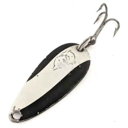 Con un peso de 3/16oz (6g), esta cucharilla vintage representa la artesanía que Lou Eppinger aportó al mundo de la pesca desde su taller en Michigan. La cara frontal de este señuelo de 1 1/2" (3,5 cm) presenta un esquema de color diagonal nítido, donde una banda blanca limpia corta entre dos campos de color negro intenso. Un logotipo de delfín en relieve destaca sobre esa franja blanca, un sutil indicador de la histórica trayectoria de producción de la marca. Al darle la vuelta al señuelo, se aprecia el sello "DARDEVLE MIDGET U.S.A." grabado directamente en el reverso de níquel pulido. Este ejemplar específico, catalogado bajo el código de producto 12850, se encuentra en un estado 5/5, conservando su brillo original y unas líneas de pintura impecables. Viene montado con su potera y anilla abierta originales, preparado para una vitrina o un equipo de pesca ligera. El orificio para la línea está perforado con precisión en el extremo estrecho, resaltando la consistencia de los troqueles patentados utilizados en su fabricación en EE. UU.