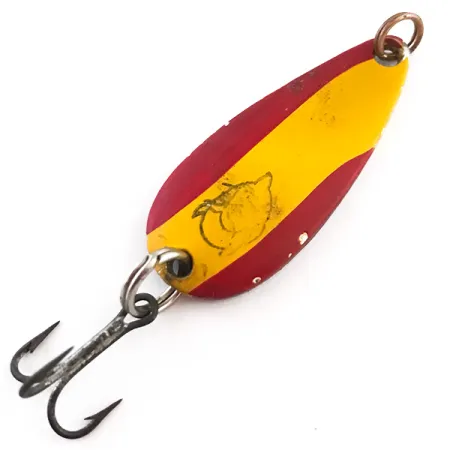 El metal con acabado de níquel en el reverso lleva estampado el sello «DARDEVLE MIDGET U.S.A.», lo que garantiza el pedigrí auténtico de Eppinger de este señuelo. Con una medida de 1 1/2 pulgadas (3,5 cm) y un peso de 3/16 oz (6 g), esta cucharilla ondulante compacta está catalogada bajo el código de producto 5428. La cara frontal muestra un vibrante patrón diagonal de color rojo y amarillo, puntuado por el reconocible logotipo negro de la cabeza del diablo cerca del enganche. Su diseño utiliza moldes exclusivos desarrollados por la empresa en Michigan para crear una forma cóncava específica destinada al lanzado o al curricán. El montaje consta de un anzuelo triple de tono oscuro y un robusto anclaje con anilla abierta en la parte posterior. Calificado con una condición de 5/5, el ejemplar muestra un acabado bien conservado con la pintura roja y amarilla manteniendo su plena saturación sobre el metal pulido. Este modelo Dardevle confía en su forma oblonga y cóncava para producir una acción de bamboleo característica cuando se recupera a través del agua.