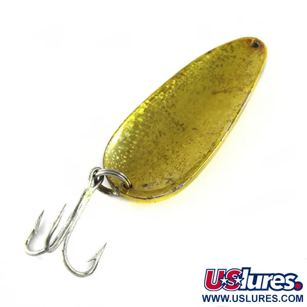 Texturas doradas martilleadas brillan en la superficie de este ejemplar vintage, resaltando el clásico patrón de color Crystal Golden Crystal. Con una longitud de 7 cm (2 3/4") y un peso sustancial de 36 g (1 1/4 oz), esta Dardevle Rok't Devle está diseñada para alcanzar grandes distancias de lanzado y profundidad. Eppinger fabrica estas cucharillas desde 1906, utilizando moldes propios para crear el icónico perfil cóncavo que las convirtió en un elemento básico en las cajas de pesca de Michigan e incluso en kits de supervivencia militares. Esta cucharilla en particular, registrada bajo el código de producto 0651, lleva estampada la marca "ROK'T" en su cara frontal. El acabado metálico muestra leves signos de su trayectoria con algunas pequeñas manchas oscuras, manteniendo un brillo hermoso que le otorga una calificación de estado de 4/5. Viene equipada con un gran anzuelo triple original en tono plateado unido por una robusta anilla abierta, y cuenta con un único orificio de sujeción en el extremo cónico.