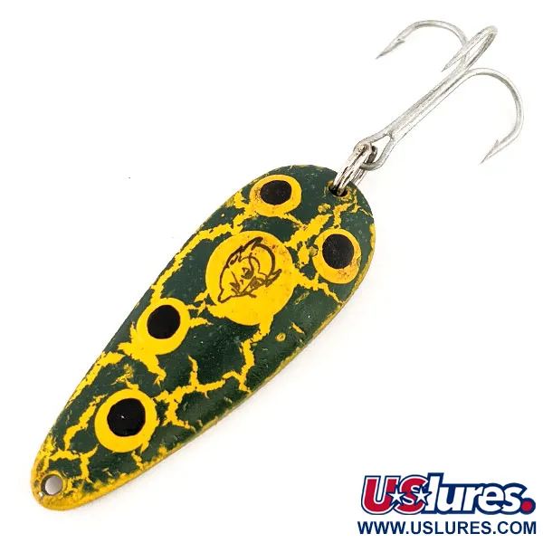 Un acabado craquelado "Frog" en verde y amarillo caracteriza a esta cucharilla de 7 cm (2 3/4"), que cuenta con cuatro anillos amarillos con centros negros que rodean un disco amarillo central. Ese disco central muestra el icónico logotipo de la cabeza de diablo de Eppinger, una marca de calidad de las raíces de la empresa en Detroit y Dearborn, Michigan. Al dar la vuelta al señuelo, se revela una superficie plateada pulida y limpia con los troquelados ROK'T-DEVLE, IMP y U.S.A. Con un peso de 21 g (3/4 oz), este ejemplar está diseñado para el lanzado en condiciones variadas donde un perfil más pesado es beneficioso. El montaje consiste en un anzuelo triple de dimensiones considerables sujeto mediante un robusto llavero en la cola. Este artículo se encuentra en un estado 5/5, luciendo notablemente bien conservado con una pintura vibrante y grabados nítidos en el reverso. El código de producto específico para esta pieza vintage es 12704.