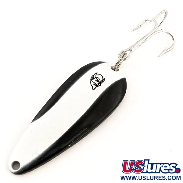 Las marcas estampadas en el reverso de latón, que incluyen «Rok't-Devle Imp» y «Dearborn, MI», sitúan la historia de esta cucharilla de 21 g (3/4 oz) en el periodo posterior al traslado del fabricante en 1959. Con una longitud de 5,5 cm (2 1/4"), el señuelo presenta una cara en blanco y negro de alto contraste con el clásico logotipo de la cabeza del diablo centrado en la sección blanca. Este clásico de Eppinger, código de producto 13066, utiliza una forma cóncava y alargada diseñada para crear una acción de balanceo cuando se pesca con una recogida lenta. Un anzuelo triple brillante está sujeto a la cola mediante un fuerte anilla abierta, sin signos de corrosión. El estado es de 5/5, tanto la pintura como el reverso de latón se ven muy limpios y bien cuidados. Mientras que el frontal blanco y negro proporciona una gran visibilidad para los peces depredadores, el reverso de latón ofrece el destello tradicional que ha estado pescando desde que Lou Eppinger fundó la empresa en 1906.