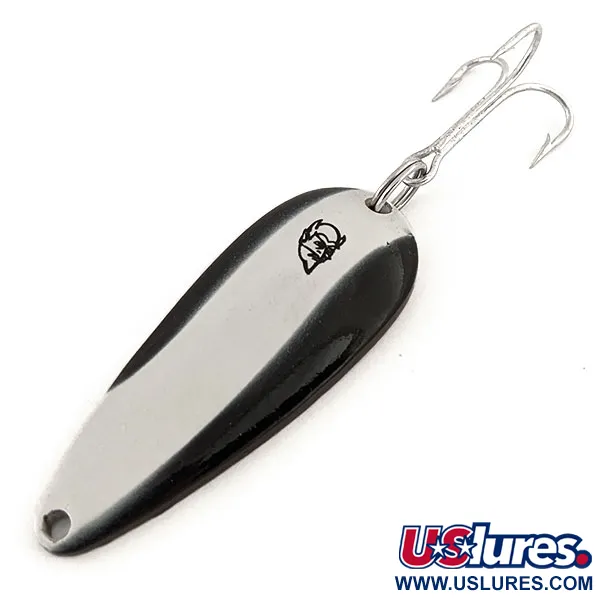 El reverso de latón de esta cucharilla está claramente grabado con la marca "ROK'T-DEVLE IMP. DEARBORN MICH.", que identifica su herencia de producción tras el traslado de Eppinger en 1959. Con unas medidas de 5,5 cm (2 1/4") y un peso de 21 g (3/4 oz), este señuelo presenta un acabado dividido de alto contraste en su cara; una mitad es de color negro sólido, mientras que la otra es de plata metálica pulida con el icónico logotipo de la cabeza de diablo en negro. Esta combinación de colores específica, asociada al código de producto 13136, está diseñada para el lanzado y utiliza una forma clásica de gota de agua cóncava para interactuar con la resistencia del agua. Este ejemplar no se ha utilizado y se conserva en excelentes condiciones, con una calificación de 5/5. La pintura es nítida y el dorso de latón muestra el acabado metálico original limpio, sin signos de uso en el campo. Viene montada con una única potera grande conectada por un robusto anilla abierta. Desde que Lou Eppinger empezó a fabricarlas a mano en Detroit en 1906, los moldes patentados utilizados para la línea Dardevle han mantenido una geometría específica que los coleccionistas reconocen de inmediato. Esta pieza es un ejemplo bien conservado de la historia del material de pesca estadounidense de la fábrica de Dearborn, Michigan.