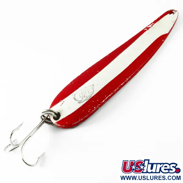 Marcadas claramente en el reverso con acabado en níquel, las inscripciones "SEADEVLET" y "DETROIT - U.S.A." confirman el origen de este ejemplar en la legendaria fábrica Eppinger. Esta cucharilla vintage presenta el clásico patrón de rayas rojas y blancas en su cara frontal, completado con el icónico logotipo de la cara del diablo centrado en la franja blanca. Con una medida de 10 cm (4") y un peso de 40 g (1 1/3 oz), posee el porte significativo necesario para lograr grandes distancias de lanzado. La superficie pintada muestra un carácter honesto con pequeños desconchones y desgaste a lo largo de los bordes, obteniendo una calificación de estado de 4/5 que resalta su historia en el agua. Fabricada con moldes propios, su característica forma cóncava está diseñada para producir una acción de bamboleo específica durante la recogida. El señuelo está equipado con un robusto anzuelo triple sujeto por una anilla abierta de alta resistencia, listo para la caja de aparejos o el expositor. Lou Eppinger trasladó la producción de Detroit a Dearborn en 1959, lo que sitúa el sello "Detroit" de esta pieza, código de producto 3675, en una era anterior de los cien años de historia de la compañía.