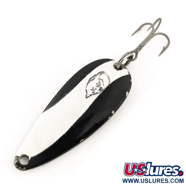 Con un peso de 1/3 oz (9 g), esta cucharilla compacta encarna el histórico legado de Detroit de los diseños originales de Lou Eppinger. El llamativo acabado Negro / Blanco / Níquel de esta Dardevle Spinnie, código de producto 11725, proporciona una visibilidad de alto contraste en diferentes claridades de agua. Con una longitud de 1 3/4" (4,5 cm), el cuerpo metálico presenta la característica forma cóncava que genera un marcado bamboleo durante la recogida. Al darle la vuelta al señuelo, se descubre una parte posterior niquelada limpia con la marca clásica "DARDEVLE SPINNIE U.S.A." estampada. Este ejemplar se encuentra en excelente estado, con una calificación de 5/5 por su pintura bien conservada y las transiciones nítidas entre las rayas negras y blancas. El montaje consta de un robusto anzuelo triple sujeto por una anilla abierta en la cola. Fabricados originalmente en Michigan, estos señuelos ganaron tal reputación por su eficacia que incluso se incluyeron en los kits de supervivencia de la aviación militar. El ojal de sujeción en el extremo cónico está libre de residuos y listo para el montaje.