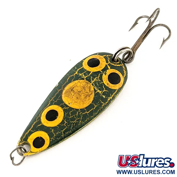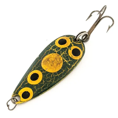 Un llamativo acabado craquelado verde define la cara de esta cucharilla de 4,5 cm (1 3/4"), que luce el codiciado patrón Frog. La artesanía de Eppinger se despliega por completo en esta Dardevle Spinnie, código de producto 12270. Este modelo presenta un diseño cóncavo distintivo, una característica de la marca desde que Lou Eppinger comenzó a fabricar señuelos a mano en Detroit. El atractivo visual proviene de grandes círculos amarillos con centros negros, dispuestos sobre una red de líneas amarillas sobre una base verde profundo. Al girar el señuelo se revela un dorso plateado limpio con la inscripción estampada "DARDEVLE SPINNE U.S.A.", confirmando sus raíces en Dearborn, Michigan. Con un peso de 9 g (1/3 oz), ofrece una masa sustancial para un señuelo de sus dimensiones. El hardware incluye un anzuelo triple y una anilla abierta, ambos con un desgaste mínimo. Este ejemplar está bellamente conservado, lo que justifica una calificación de estado de 5/5. La nitidez de las letras en la parte posterior proporciona un vínculo claro con las matrices de fabricación exclusivas de la fábrica Eppinger.