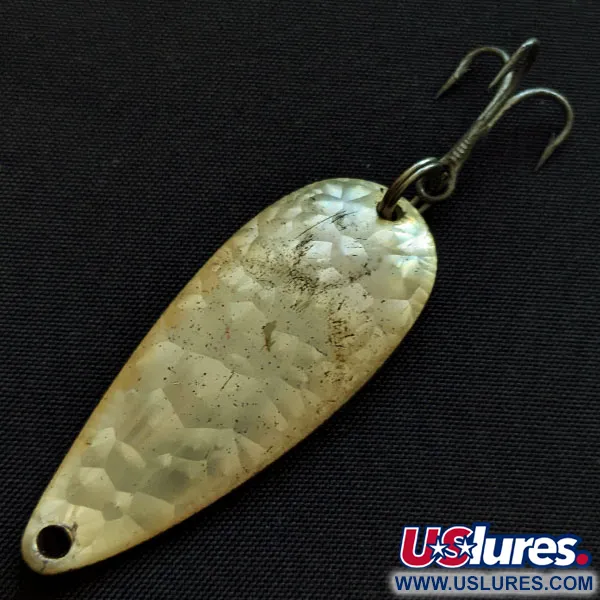 Las facetas metálicas martilladas captan la luz a través del exclusivo acabado Crystal de esta clásica cucharilla de fabricación estadounidense. Con el sello del fabricante y la inscripción "SPINNIE U.S.A." grabados claramente en el reverso, esta Eppinger Dardevle, con código de producto 18714, representa el legado que Lou Eppinger inició en 1906. Este ejemplar mide 4,5 cm (1 3/4") y pesa 9 g (1/3 oz), lo que lo convierte en una opción sólida para una gran variedad de depredadores de agua dulce en la pesca a lance. Su estado es un sólido 4/5, con una superficie limpia y un anzuelo triple robusto que sigue listo para la acción. Eppinger utiliza troqueles propios para lograr la forma oblonga y el perfil cóncavo específicos, que son fundamentales para el movimiento de balanceo que el señuelo genera durante una recogida lineal. Para condiciones de aguas claras, las propiedades reflectantes de este acabado metálico específico han sido un elemento esencial para generaciones de pescadores.