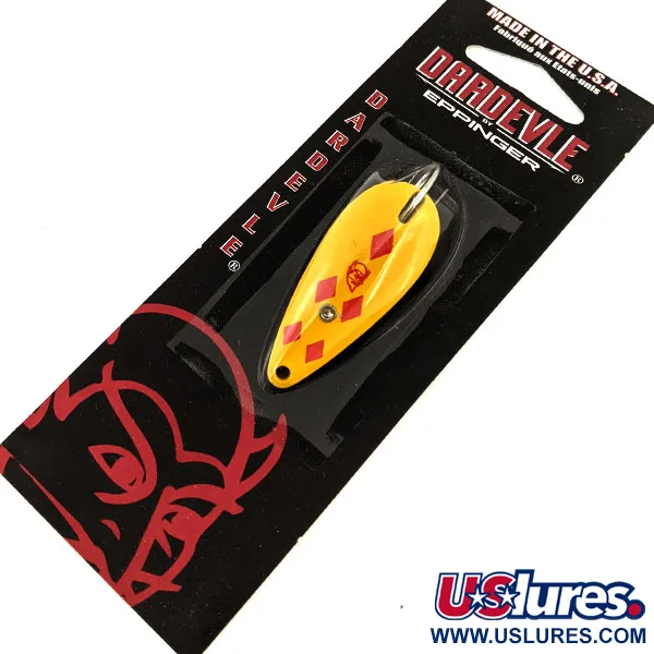 Cinco diamantes rojos destacan sobre un acabado amarillo vibrante en la cara convexa de esta Eppinger Dardevle Spinnie Weedless. Identificado bajo el código de producto 20297, este señuelo de 1/4 oz (7 g) mide 1 3/4" (4,5 cm) y presenta el popular patrón "Five of Diamonds". El diseño anti-hierba incorpora un anzuelo simple protegido por un protector de alambre, concebido para lanzar en coberturas donde suelen refugiarse el black bass, la trucha o los peces de sol. Fabricado con el reverso de latón, este ejemplar se produce en EE. UU. utilizando las matrices exclusivas de Eppinger. El señuelo no ha sido utilizado y se conserva en su embalaje original de venta en color negro y rojo, que muestra el número de referencia de fábrica 9517. Este modelo continúa el legado de la marca Eppinger, que trasladó su producción a Dearborn, Michigan, en 1959. El clásico logotipo de la cabeza de diablo en el cartón marca su lugar en una historia de fabricación de señuelos que comenzó en Detroit en 1906.