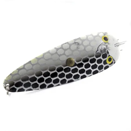 Con un peso considerable de 40 g (1 1/3 oz), esta Eppinger Dardevle Trolldevle es una opción robusta para alcanzar las profundidades deseadas al lanzar o hacer curricán. La cucharilla muestra un patrón de escamas en forma de panal en blanco y negro de alto contraste, complementado con dos ojos amarillos intensos. Con 11,5 cm (4 1/2") de largo, este modelo 1178 está diseñado para ser eficaz en coberturas densas, contando con un protector anti-algas sobre su resistente anzuelo simple. El reverso de níquel pulido lleva el sello "Dearborn, MI", una referencia a la historia de la empresa tras mudarse de su ubicación original en Detroit en 1959. Calificada con un estado de 4/5, la pieza muestra un ligero desgaste por manipulación manteniendo un aspecto brillante y limpio. Su curvatura oblonga específica está diseñada para una acción de bamboleo constante, siguiendo los mismos estándares de fabricación estadounidense establecidos por Lou Eppinger en 1906.