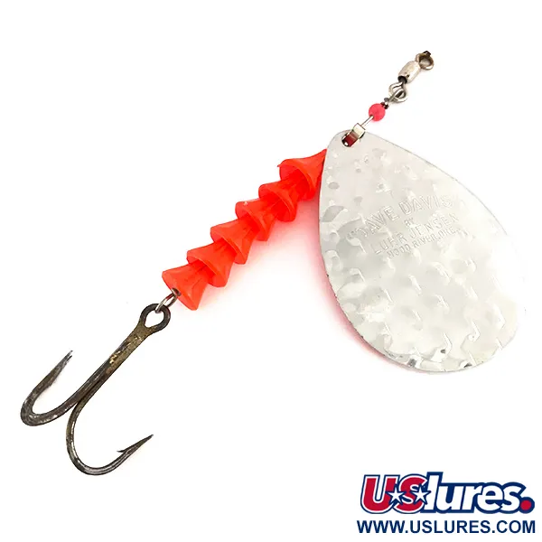 Las texturas de níquel martilleado en la pala en forma de gota proporcionan una superficie reflectante clásica que define a este modelo Luhr Jensen. Con una longitud de 13 cm (5") y un peso de 17 g (3/5 oz), esta cucharilla de curricán Dave Davis UV, identificada con el código 7673, incorpora una serie de cinco cuentas de plástico cónicas en un tono naranja-rosa fluorescente. Estas cuentas están diseñadas para reaccar bajo la luz ultravioleta, haciendo que el montaje sea visible en capas de agua profundas o en condiciones nubladas. El reverso de la pala está acabado en un naranja mate sólido, ofreciendo un contraste marcado con el frente metálico brillante. En el extremo terminal, un anzuelo triple de acabado oscuro está sujeto mediante un lazo de alambre, mientras que el extremo frontal cuenta con un quitavueltas de barril para facilitar la rotación durante el curricán. Con una calificación de 4/5, el señuelo muestra una pintura bien conservada y un metal brillante de su época de fabricación estadounidense.