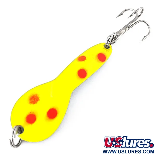 Con una longitud exacta de 5 cm, esta cucharilla presenta un perfil distintivo en forma de pala acabado en una base amarilla vibrante con cinco llamativos puntos rojo-anaranjados. El Acme Dazzler #2 UV, con el código de producto 10800, es una rareza descatalogada que se mantiene en estado nuevo. Su acabado UV especializado emite un fuerte brillo verde en entornos de poca luz, una característica técnica diseñada para atraer la atención en profundidades de hasta 1 m. Con un peso de 7 g, el señuelo está montado con anillas abiertas plateadas originales y un anzuelo triple afilado, listo para el lanzado o curricán. Este ejemplar fabricado en EE. UU. es un ejemplo clásico de las primeras innovaciones de Acme en acabados reactivos a la luz.