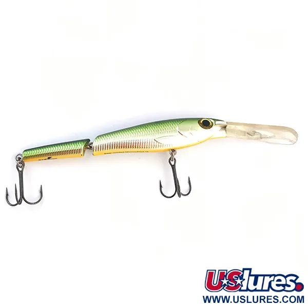 Un lomo verde vibrante transiciona hacia patrones de escamas plateadas en este señuelo articulado, que cuenta con una prominente barriga amarilla y el logotipo "STORM" troquelado cerca del enganche del anzuelo trasero. Catalogado con el código 4942, este Deep Jointed Minnow Stick 14 mide 14 cm (5 1/2") y pesa 25 g (1 oz). El diseño del cuerpo en dos piezas se combina con un babero grande y transparente diseñado para alcanzar profundidades de hasta 5,6 m (18,4 ft), aunque normalmente opera en el rango de 1,5 m (5 ft) a 3 m (10 ft) durante el lanzado. Sus herrajes consisten en dos robustos anzuelos triples sujetos mediante anillas abiertas reforzadas. Grandes ojos dorados con pupilas oscuras proporcionan un punto focal en la cabeza, que también presenta detalles de agallas moldeadas. Este ejemplar está en condición 5/5, manteniendo un acabado limpio en su totalidad. Un sistema de sonajero interno proporciona un perfil acústico ruidoso al moverse a través de la columna de agua.