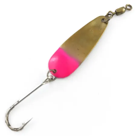 El peso de 1,7 g (1/16 oz) le da a este Dick Nite #2 el perfil ideal para presentaciones delicadas en aguas claras. Con una longitud de 3,5 cm (1 1/2"), la cucharilla presenta un acabado bitono Oro / Rojo, con la parte roja mostrando una cualidad fluorescente vibrante que destaca sobre la base metálica. El nombre de la marca está claramente estampado en el metal dorado, identificando su origen en la empresa Dick Nite Spoons en USA. Este ejemplar en particular, identificado con el código de producto 5314, viene equipado con su emerillón de barril de latón original y un anzuelo simple de tija larga. Con una calificación de estado de 4/5, el señuelo muestra una superficie limpia y herrajes bien conservados. El fino calibre del metal utilizado en su construcción refleja las técnicas de fabricación tradicionales de estos señuelos, diseñados específicamente para un uso eficaz al curricán a velocidades lentas.