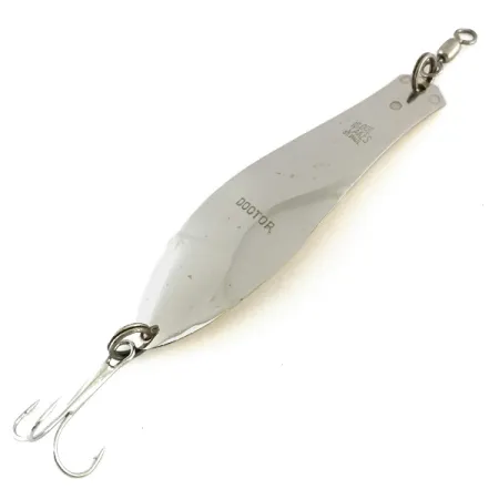 Estampada en el metal con la marca "DOCTOR" y el origen "USA", esta cucharilla de 9,5 cm muestra un acabado bicolor de alto contraste. Un lado presenta un niquelado reflectante, mientras que el reverso tiene un acabado en oro pulido, proporcionando diferentes perfiles de destello según el ángulo de la luz. Con un peso de 17 g, su sólida estructura metálica la convierte en una opción sustancial tanto para lances como para curricán. El montaje consta de un esmerillón de barril en la parte superior para evitar la torsión de la línea y un fuerte anzuelo triple sujeto mediante un anilla abierta en la parte posterior. En cuanto a su estado, se mantiene en un excelente 5/5, con las superficies conservando su brillo original y los grabados nítidos y legibles. Este modelo específico, identificado con el código de producto 8515, representa un diseño clásico utilizado por generaciones de pescadores para buscar grandes depredadores de agua dulce.