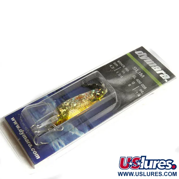 Con un peso de 8g (1/4oz), esta cucharilla ondulante Dymara presenta un acabado Trucha arcoíris vibrante que captura la luz en su superficie texturizada. Fabricada en Canadá por Dymara Industries, esta unidad específica, catalogada con el código de producto 0838, mide 4,5cm (1 3/4"). El embalaje lo identifica como el modelo "Slim", concretamente el número de referencia SL 400 008. El señuelo se conserva en su blíster original, manteniendo un estado de 6, lo que indica que está sin usar y preservado tal como salió de la fábrica de Campbell River, B.C. Diseñada para ser versátil, la parte posterior del cartón indica su idoneidad para el lanzado, curricán y jigging, advirtiendo que el señuelo no debe doblarse. El montaje incluye un anzuelo triple afilado y un llavero resistente, típicos de la construcción fiable que se esperaba de este fabricante ya desaparecido. El patrón de Trucha arcoíris está meticulosamente aplicado con una mezcla de escamas doradas y plateadas brillantes, acentuadas por una sutil línea lateral rosa y motas oscuras.
