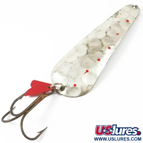 Fabricada en Suiza, esta cucharilla de 9 g (1/3 oz) refleja la herencia tradicional de la metalurgia de EGB. El cuerpo de latón martilleado a mano está acabado con un auténtico baño de plata, una técnica elegida específicamente por sus propiedades reflectantes en diversas condiciones de luz. En la cara frontal con hoyuelos, una fila diagonal de seis puntos rojos aporta un sutil acento visual sobre la brillante superficie plateada. Con una longitud de 8 cm (3 1/4"), este ejemplar está catalogado bajo el código de producto 3429 y mantiene una calificación de estado de 4/5, mostrando ligeras señales de su historia. El reverso revela los tonos cálidos del latón base, característicos de la construcción de plata sobre latón. El montaje consta de un anzuelo triple junto con una pequeña aleta atractora roja en forma de corazón, diseñada para la pesca al curricán.